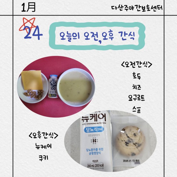 1월24일 오전/오후간식 페이지 정보 작성자 명품다산주야간보호센터 작성일26-01-24 14:21 조회988회 댓글0건 관련링크 이전글 다음글 목록 본문 오전/오후간식 입니다. 이전글 다음글 목록