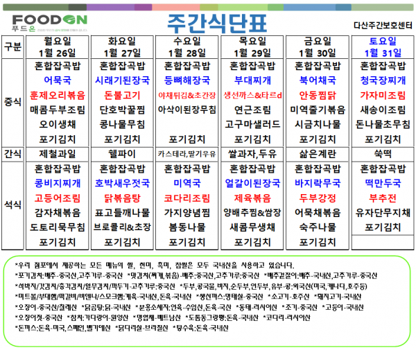 <<< 1월4주차 주간 식단표 >>> 페이지 정보 작성자 명품다산주야간보호센터 작성일26-01-26 08:51 조회1,006회 댓글0건 관련링크 이전글 다음글 목록 본문 1월4주차 주간 식단표 입니다. 이전글 다음글 목록