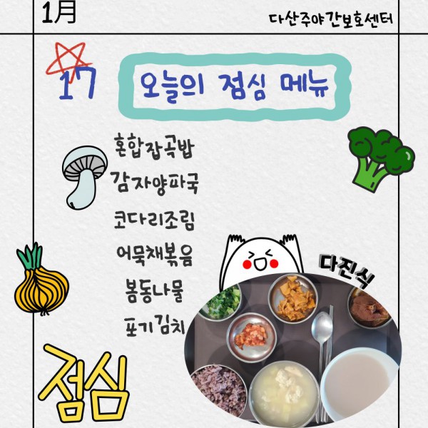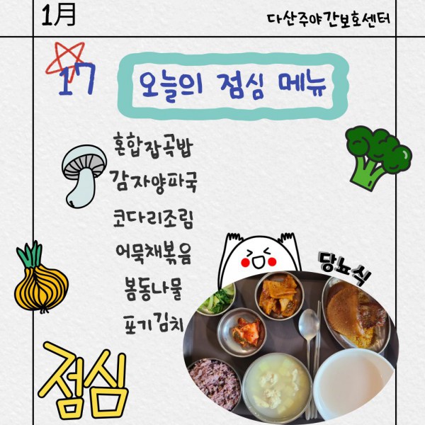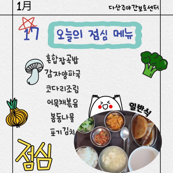 1월17일 점심식단 페이지 정보 작성자 명품다산주야간보호센터 작성일26-01-17 11:21 조회988회 댓글0건 관련링크 이전글 다음글 목록 본문 점심식단 입니다.(일반식,당뇨식,간반식) 이전글 다음글 목록