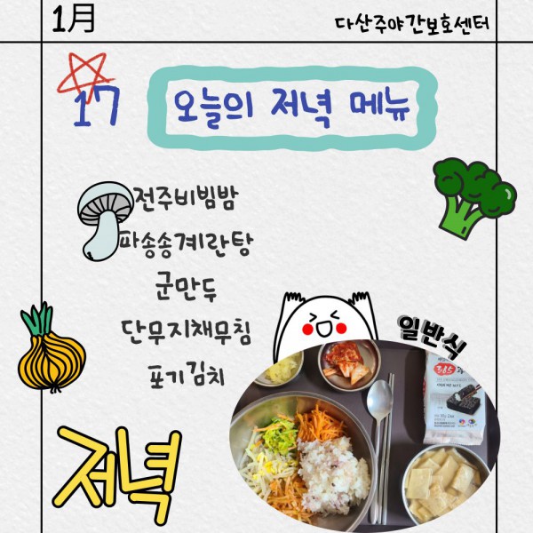 1월17일 저녁식단 페이지 정보 작성자 명품다산주야간보호센터 작성일26-01-17 16:02 조회983회 댓글0건 관련링크 이전글 다음글 목록 본문 저녁식단 입니다. 이전글 다음글 목록