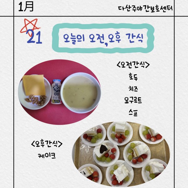 1월21일 오전/오후간식 페이지 정보 작성자 명품다산주야간보호센터 작성일26-01-21 15:35 조회1,006회 댓글0건 관련링크 이전글 다음글 목록 본문 오전/오후간식 입니다. 이전글 다음글 목록
