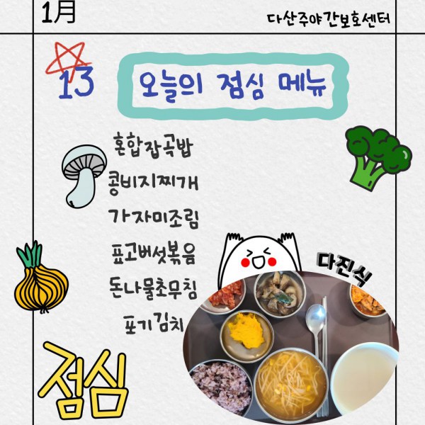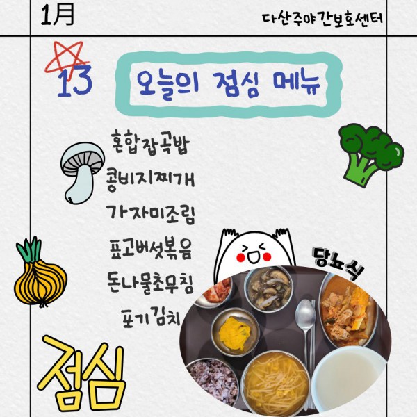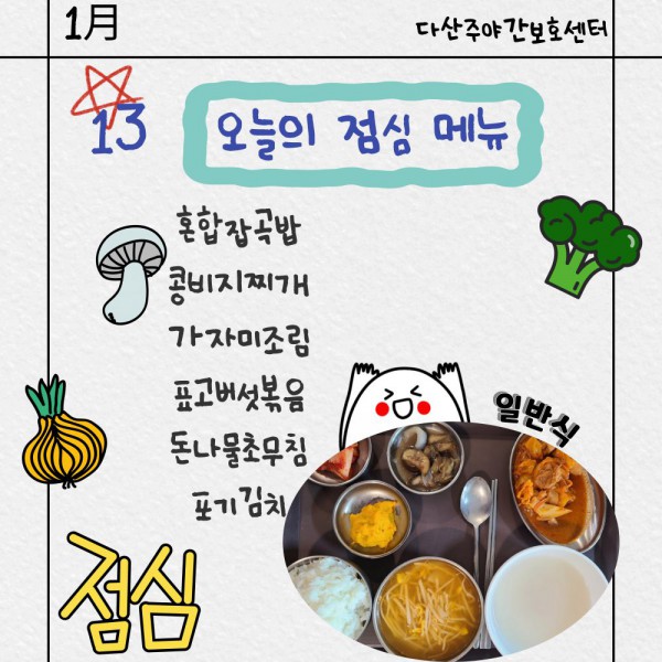 1월13일 점심식단 페이지 정보 작성자 명품다산주야간보호센터 작성일26-01-13 11:23 조회1,007회 댓글0건 관련링크 이전글 다음글 목록 본문 점심식단 입니다.(일반식,당뇨식,간반식) 이전글 다음글 목록