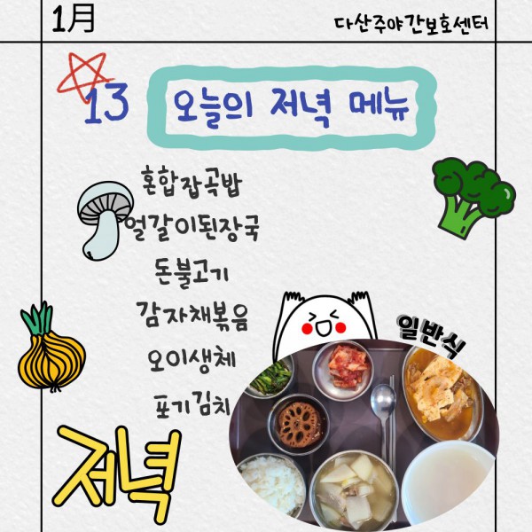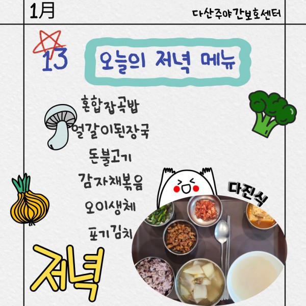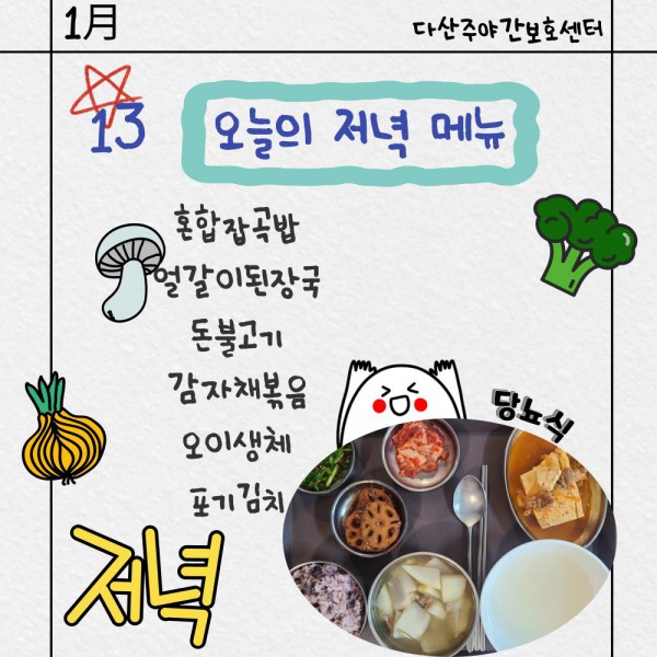 1월13일 저녁식단 페이지 정보 작성자 명품다산주야간보호센터 작성일26-01-13 16:11 조회997회 댓글0건 관련링크 이전글 다음글 목록 본문 저녁식단 입니다.(일반식,당뇨식,간반식) 이전글 다음글 목록