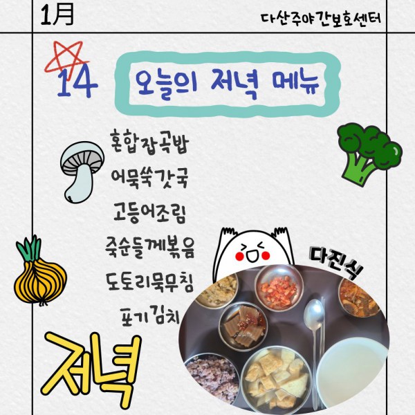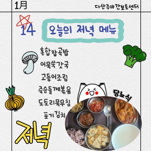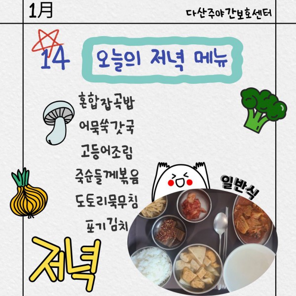 1월14일 저녁식단 페이지 정보 작성자 명품다산주야간보호센터 작성일26-01-14 16:05 조회1,009회 댓글0건 관련링크 이전글 다음글 목록 본문 저녁식단 입니다.(일반식,당뇨식,간반식) 이전글 다음글 목록
