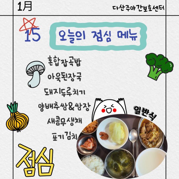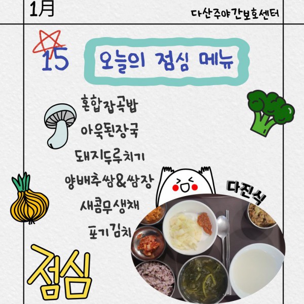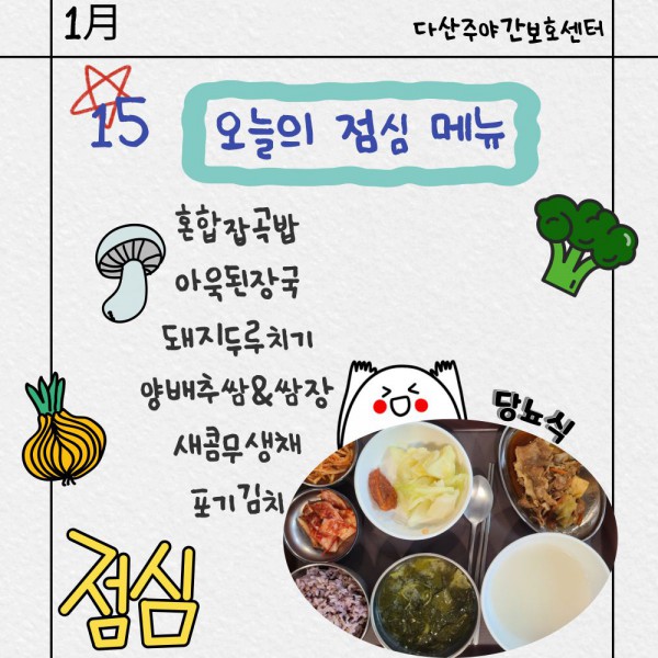 1월15일 점심식단 페이지 정보 작성자 명품다산주야간보호센터 작성일26-01-15 11:17 조회1,009회 댓글0건 관련링크 이전글 다음글 목록 본문 점심식단 입니다.(일반식,당뇨식,간반식) 이전글 다음글 목록