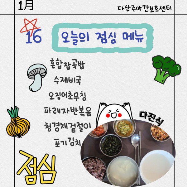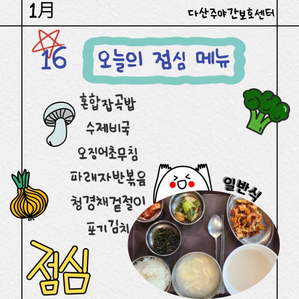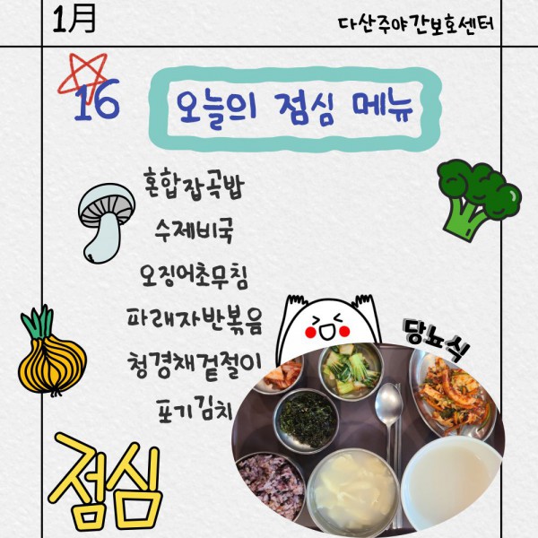 1월16일 점심식단 페이지 정보 작성자 명품다산주야간보호센터 작성일26-01-16 11:51 조회996회 댓글0건 관련링크 이전글 다음글 목록 본문 점심식단 입니다.(일반식,당뇨식,간반식) 이전글 다음글 목록