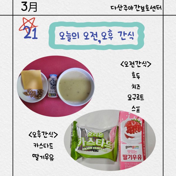 3월21일 오전/오후간식 페이지 정보 작성자 명품다산주야간보호센터 작성일26-03-21 17:48 조회600회 댓글0건 관련링크 이전글 다음글 목록 본문 오전/오후간식 입니다. 이전글 다음글 목록