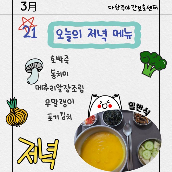 3월21일 저녁식단 페이지 정보 작성자 명품다산주야간보호센터 작성일26-03-21 17:48 조회595회 댓글0건 관련링크 이전글 다음글 목록 본문 저녁식단 입니다. 이전글 다음글 목록