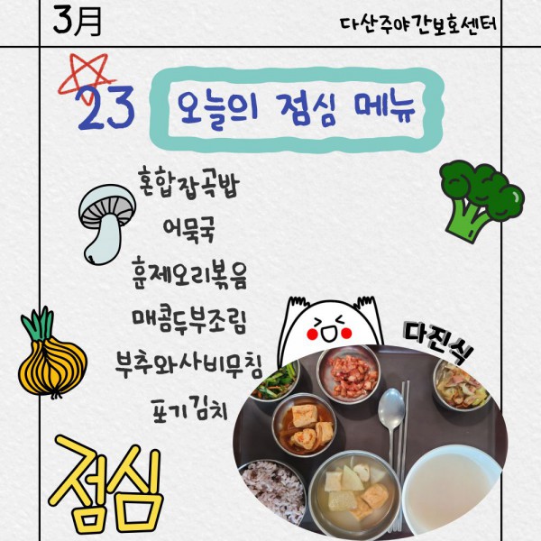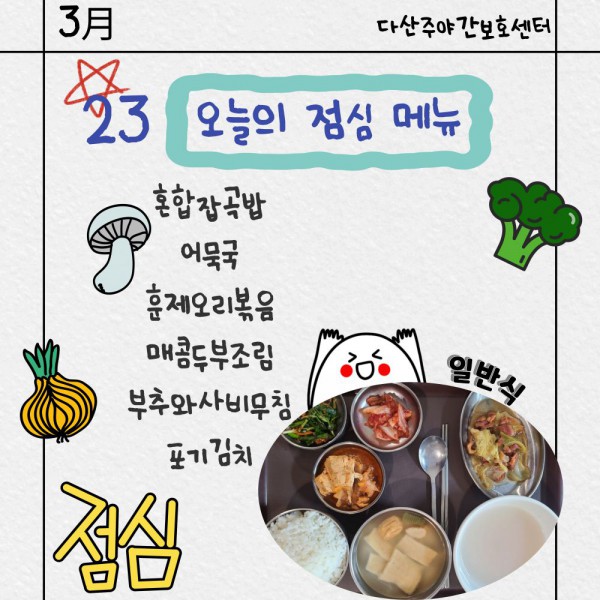 3월23일 점심식단 페이지 정보 작성자 명품다산주야간보호센터 작성일26-03-23 11:57 조회588회 댓글0건 관련링크 이전글 다음글 목록 본문 점심식단 입니다.(일반식,당뇨식,간반식) 이전글 다음글 목록