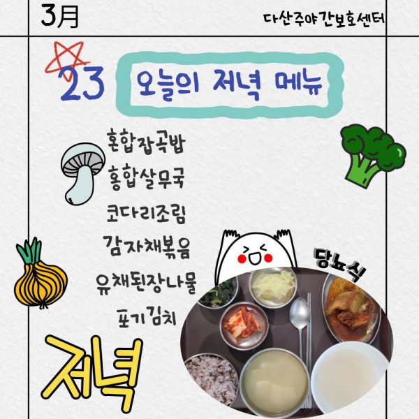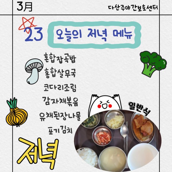3월23일 저녁식단 페이지 정보 작성자 명품다산주야간보호센터 작성일26-03-23 16:08 조회588회 댓글0건 관련링크 이전글 다음글 목록 본문 저녁식단 입니다.(일반식,당뇨식) 이전글 다음글 목록