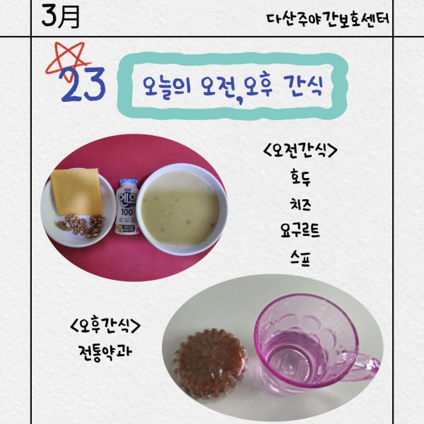 3월24일 오전/오후간식 페이지 정보 작성자 명품다산주야간보호센터 작성일26-03-24 15:17 조회515회 댓글0건 관련링크 이전글 다음글 목록 본문 3/24일 오전/오후간식 입니다. 이전글 다음글 목록