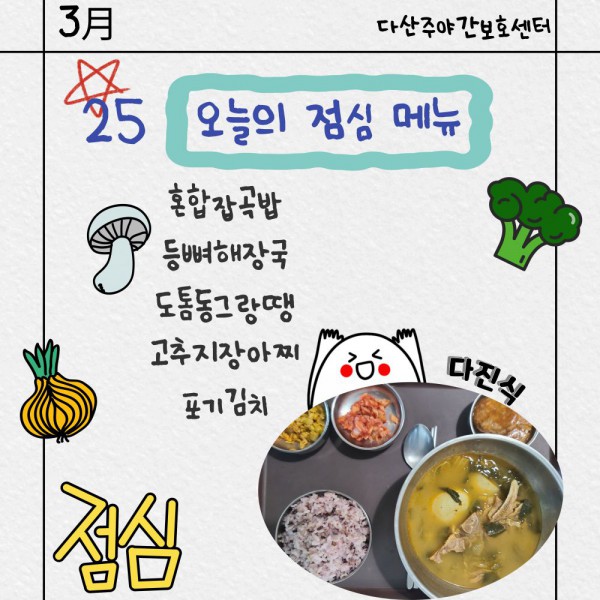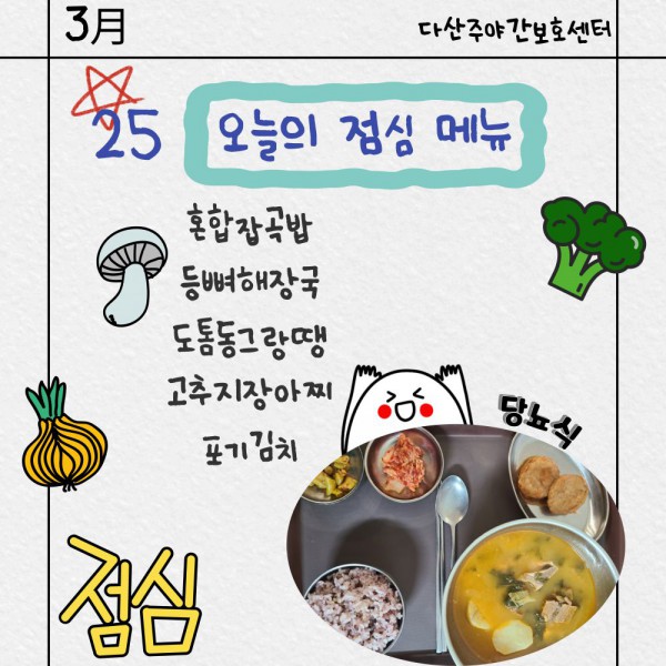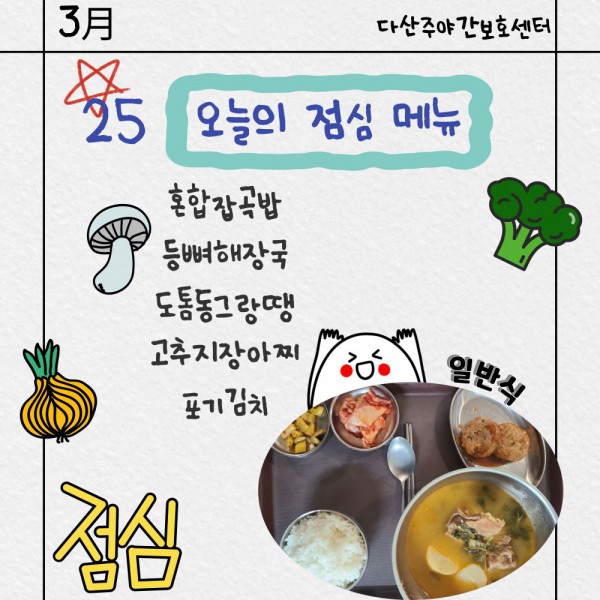 3월25일 점심식단 페이지 정보 작성자 명품다산주야간보호센터 작성일26-03-25 11:19 조회464회 댓글0건 관련링크 이전글 다음글 목록 본문 점심식단 입니다.(일반식,당뇨식,간반식) 이전글 다음글 목록
