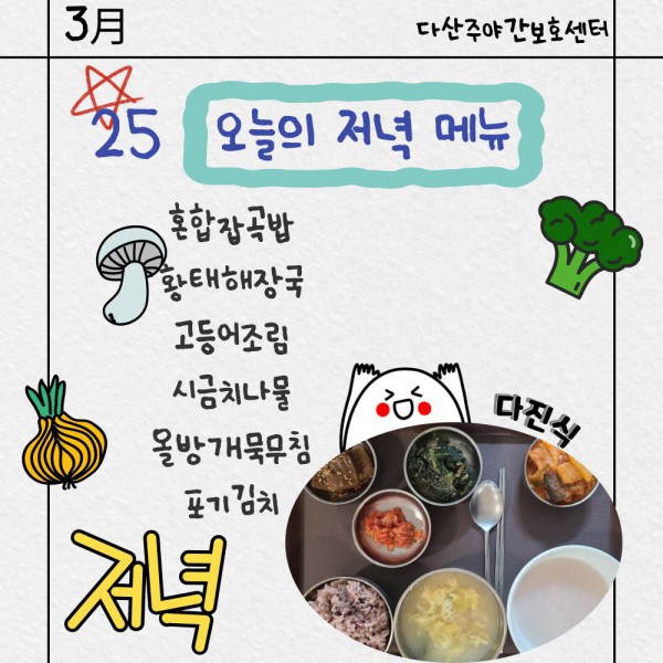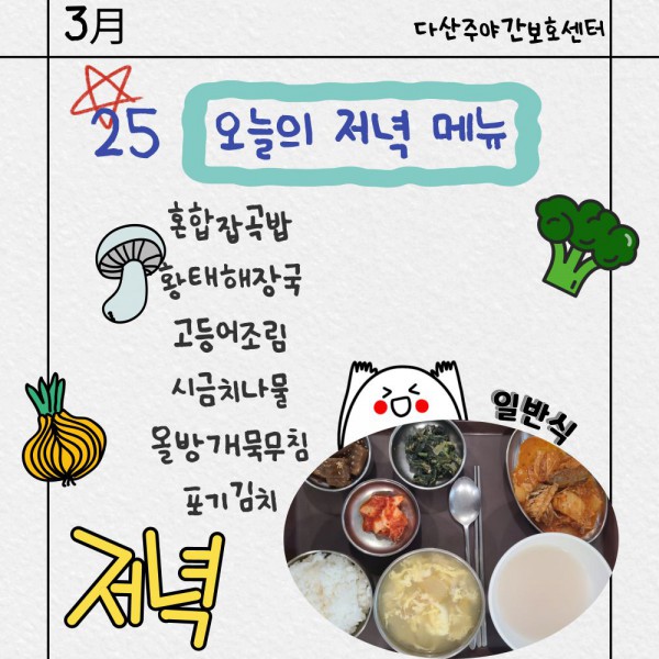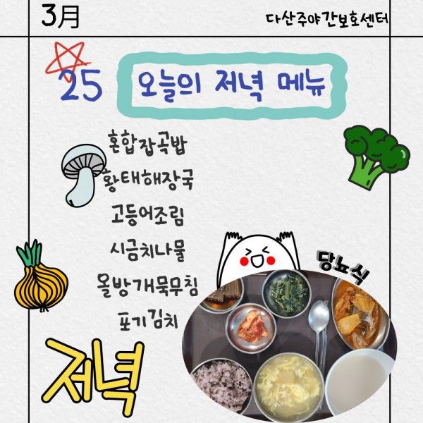 3월25일 저녁식단 페이지 정보 작성자 명품다산주야간보호센터 작성일26-03-25 16:06 조회448회 댓글0건 관련링크 이전글 다음글 목록 본문 저녁식단 입니다.(일반식,당뇨식,간반식) 이전글 다음글 목록