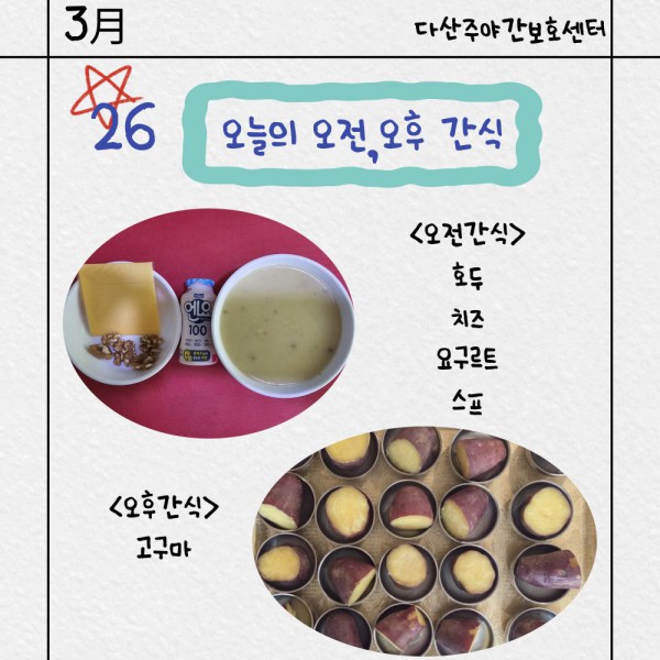 3월26일 오전/오후간식 페이지 정보 작성자 명품다산주야간보호센터 작성일26-03-26 15:20 조회389회 댓글0건 관련링크 이전글 다음글 목록 본문 오전/오후간식 입니다. 이전글 다음글 목록