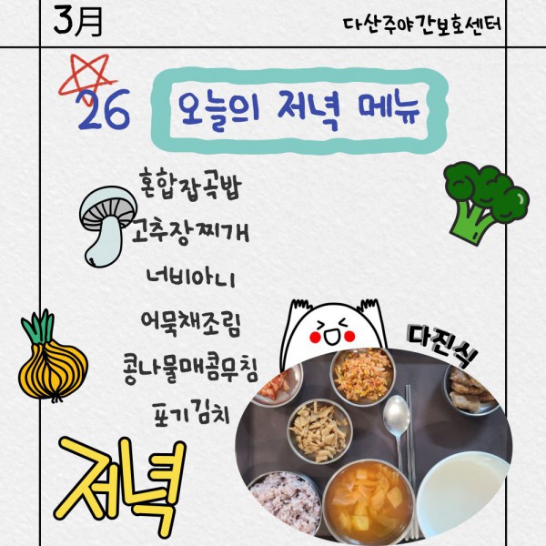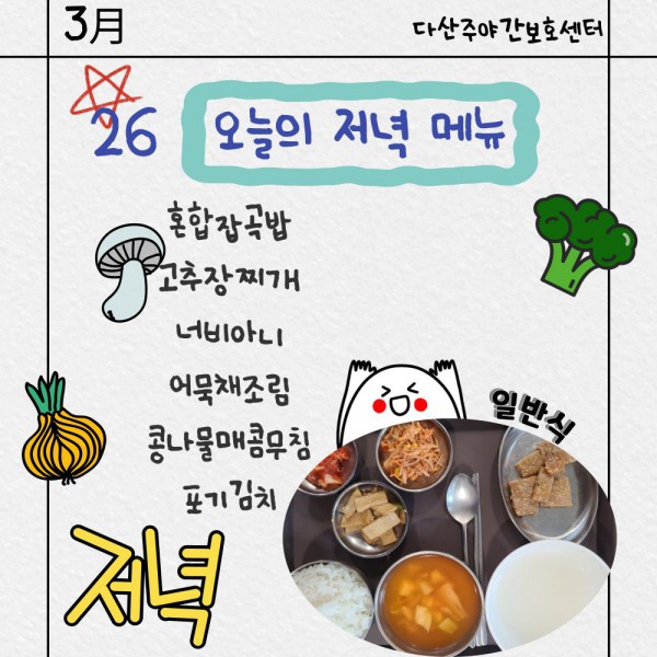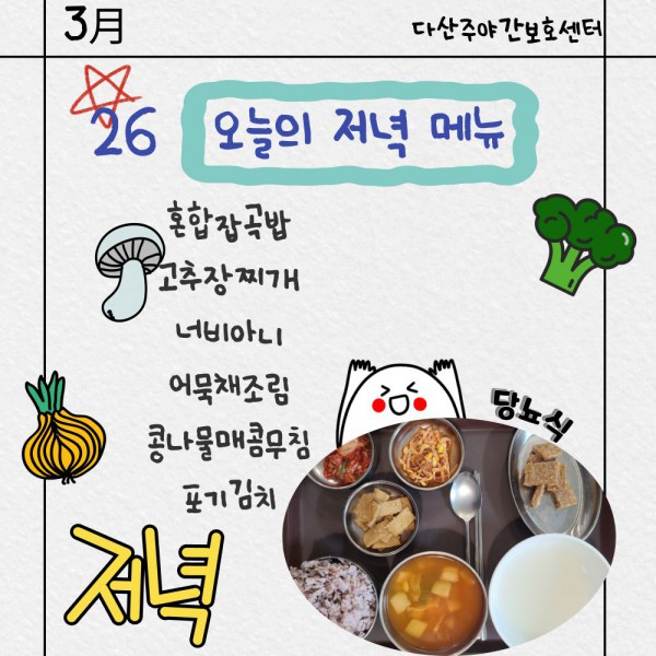 3월26일 저녁식단 페이지 정보 작성자 명품다산주야간보호센터 작성일26-03-26 16:05 조회384회 댓글0건 관련링크 이전글 다음글 목록 본문 저녁식단 입니다.(일반식,당뇨식,간반식) 이전글 다음글 목록