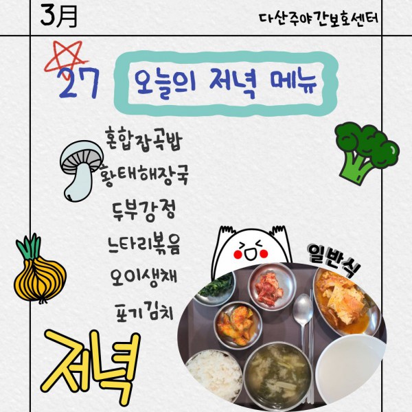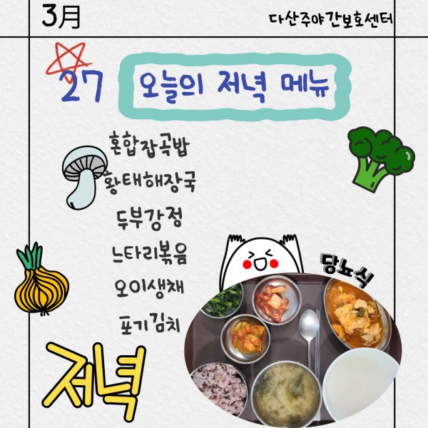3월27일 저녁식단 페이지 정보 작성자 명품다산주야간보호센터 작성일26-03-27 16:17 조회364회 댓글0건 관련링크 이전글 다음글 목록 본문 저녁식단 입니다.(일반식,당뇨식) 이전글 다음글 목록
