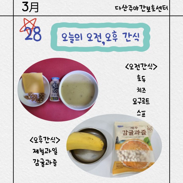 3월28일 오전/오후간식 페이지 정보 작성자 명품다산주야간보호센터 작성일26-03-28 16:58 조회307회 댓글0건 관련링크 이전글 다음글 목록 본문 오전/오후간식 입니다. 이전글 다음글 목록