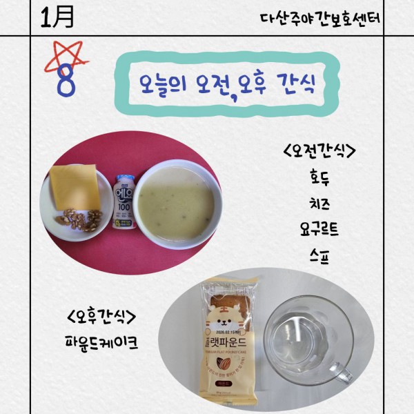 1월8일 오전/오후간식 페이지 정보 작성자 명품다산주야간보호센터 작성일26-01-08 15:20 조회1,032회 댓글0건 관련링크 이전글 다음글 목록 본문 오전/오후간식 입니다. 이전글 다음글 목록