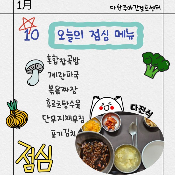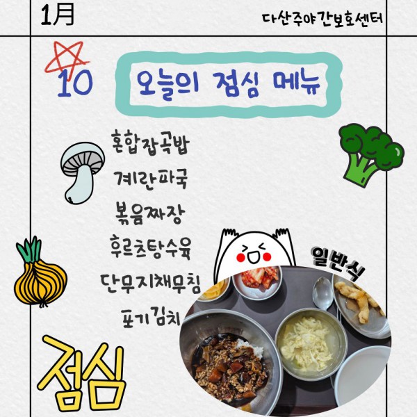 1월10일 점심식단 페이지 정보 작성자 명품다산주야간보호센터 작성일26-01-10 13:56 조회1,009회 댓글0건 관련링크 이전글 다음글 목록 본문 점심식단 입니다.(일반식,당뇨식,간반식) 이전글 다음글 목록