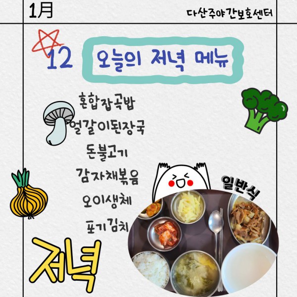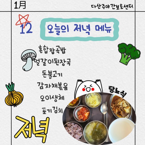 1월12일 저녁식단 페이지 정보 작성자 명품다산주야간보호센터 작성일26-01-12 16:04 조회1,013회 댓글0건 관련링크 이전글 다음글 목록 본문 저녁식단 입니다.(일반식,당뇨식) 이전글 다음글 목록