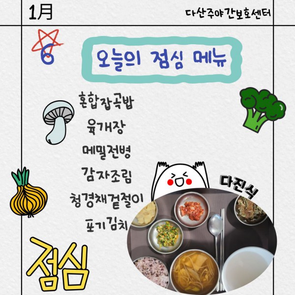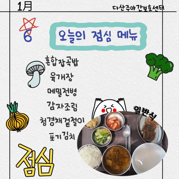 1월6일 점심식단 페이지 정보 작성자 명품다산주야간보호센터 작성일26-01-06 14:50 조회1,019회 댓글0건 관련링크 이전글 다음글 목록 본문 점심식단 입니다.(일반식,당뇨식,간반식) 이전글 다음글 목록