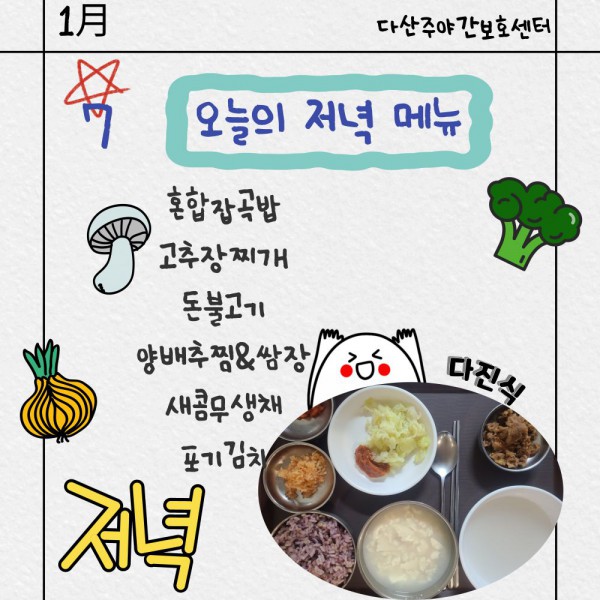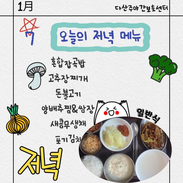 1월7일 저녁식단 페이지 정보 작성자 명품다산주야간보호센터 작성일26-01-07 16:00 조회1,014회 댓글0건 관련링크 이전글 다음글 목록 본문 저녁식단 입니다.(일반식,당뇨식,간반식) 이전글 다음글 목록