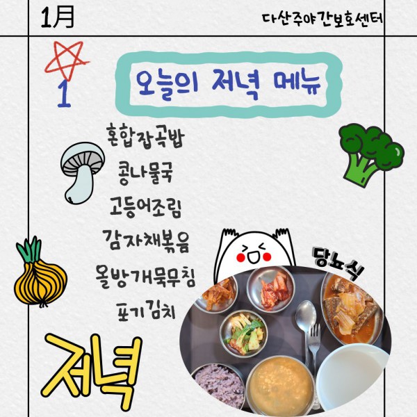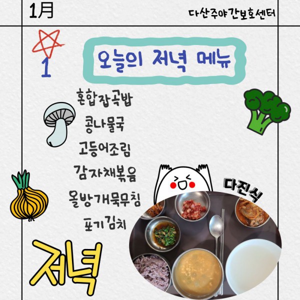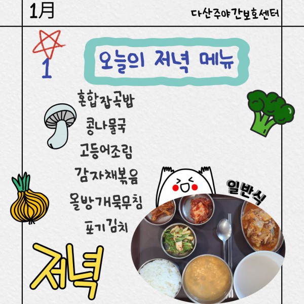 1월1일 저녁식단 페이지 정보 작성자 명품다산주야간보호센터 작성일26-01-01 15:58 조회1,029회 댓글0건 관련링크 이전글 다음글 목록 본문 저녁식단 입니다.(일반식,당뇨식,간반식) 이전글 다음글 목록