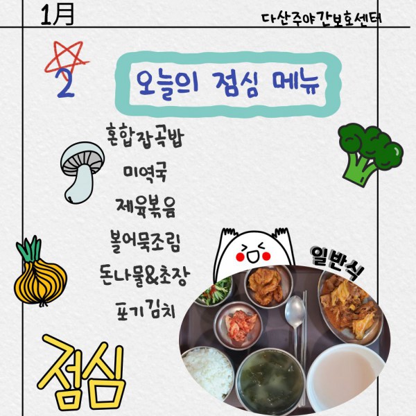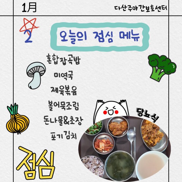 1월2일 점심식단 페이지 정보 작성자 명품다산주야간보호센터 작성일26-01-02 11:35 조회1,022회 댓글0건 관련링크 이전글 다음글 목록 본문 점심식단 입니다.(일반식,당뇨식,간반식) 이전글 다음글 목록