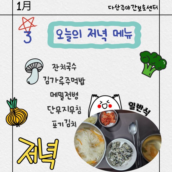 1월3일 저녁식단 페이지 정보 작성자 명품다산주야간보호센터 작성일26-01-03 16:44 조회1,024회 댓글0건 관련링크 이전글 다음글 목록 본문 저녁식단 입니다. 이전글 다음글 목록