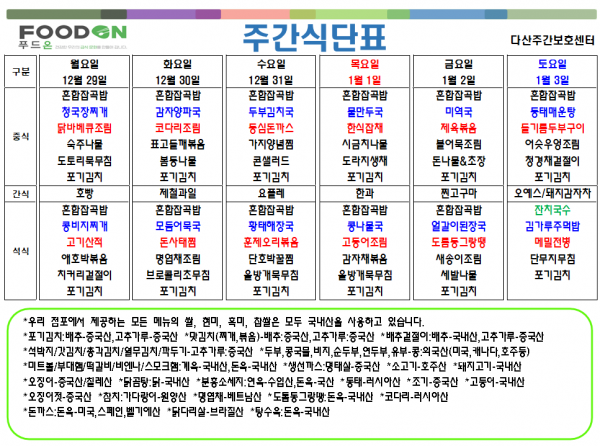<<< 12월5주차 주간 식단표 >>> 페이지 정보 작성자 명품다산주야간보호센터 작성일25-12-29 09:24 조회1,068회 댓글0건 관련링크 이전글 다음글 목록 본문 12월5주차 주간 식단표 입니다. 이전글 다음글 목록