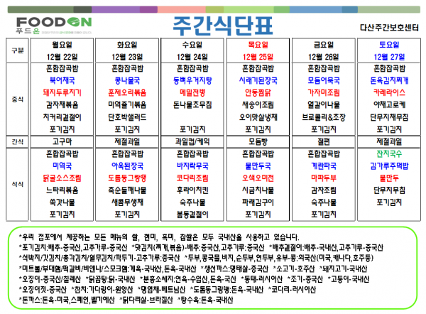 <<< 12월4주차 주간 식단표 >>>< 페이지 정보 작성자 명품다산주야간보호센터 작성일25-12-22 09:33 조회1,088회 댓글0건 관련링크 이전글 다음글 목록 본문 12월4주차 주간 식단표 입니다. 이전글 다음글 목록