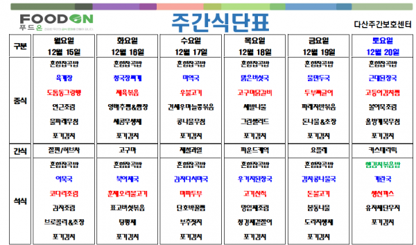 <<< 12월3주차 주간 식단표 >>> 페이지 정보 작성자 명품다산주야간보호센터 작성일25-12-15 09:15 조회1,287회 댓글0건 관련링크 이전글 다음글 목록 본문 12월3주차 주간 식단표 입니다. 이전글 다음글 목록