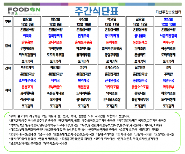 <<< 12월2주차 주간 식단표 >>> 페이지 정보 작성자 명품다산주야간보호센터 작성일25-12-08 09:21 조회1,281회 댓글0건 관련링크 이전글 다음글 목록 본문 12월2주차 주간 식단표 입니다. 이전글 다음글 목록