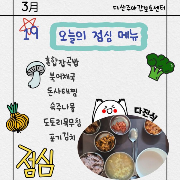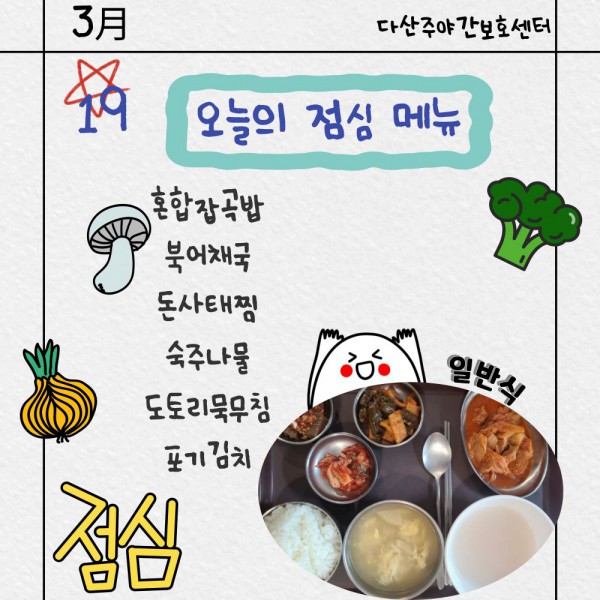3월19일 점심식단 페이지 정보 작성자 명품다산주야간보호센터 작성일26-03-19 11:55 조회599회 댓글0건 관련링크 이전글 다음글 목록 본문 점심식단 입니다.(일반식,당뇨식,간반식) 이전글 다음글 목록