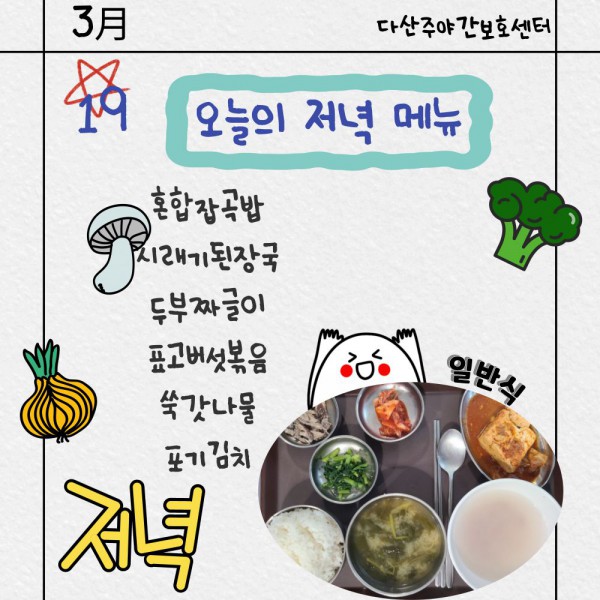 3월19일 저녁식단 페이지 정보 작성자 명품다산주야간보호센터 작성일26-03-19 16:12 조회596회 댓글0건 관련링크 이전글 다음글 목록 본문 저녁식단 입니다.(일반식,당뇨식,간반식) 이전글 다음글 목록
