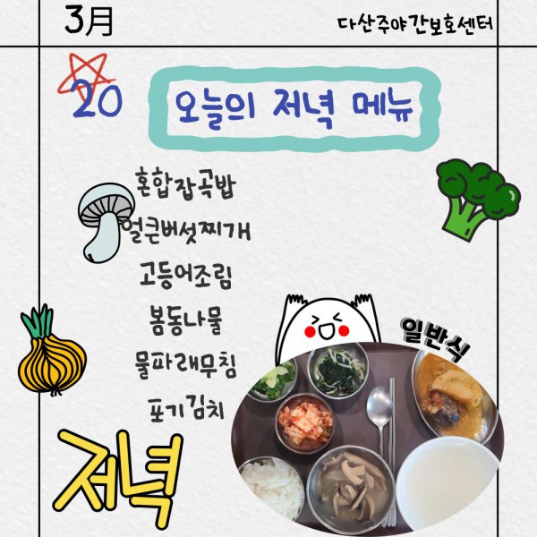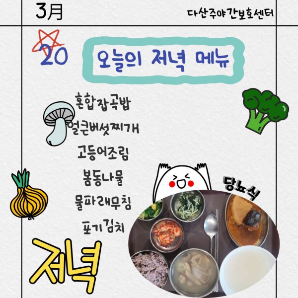 3월20일 저녁식단 페이지 정보 작성자 명품다산주야간보호센터 작성일26-03-20 16:09 조회599회 댓글0건 관련링크 이전글 다음글 목록 본문 저녁식단 입니다.(일반식,당뇨식) 이전글 다음글 목록
