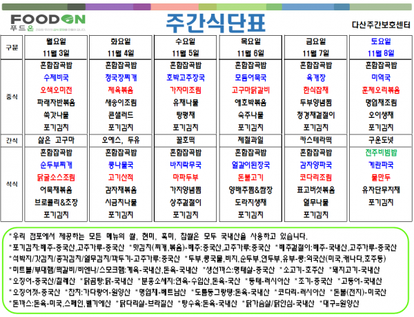 <<< 11월1주차 주간 식단표 >>> 페이지 정보 작성자 명품다산주야간보호센터 작성일25-11-03 07:17 조회1,445회 댓글0건 관련링크 이전글 다음글 목록 본문 11월1주차 주간 식단표 입니다. 이전글 다음글 목록