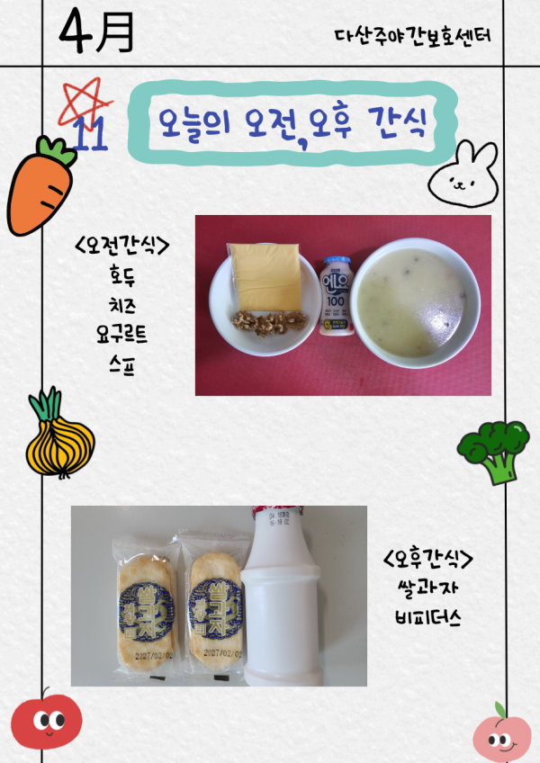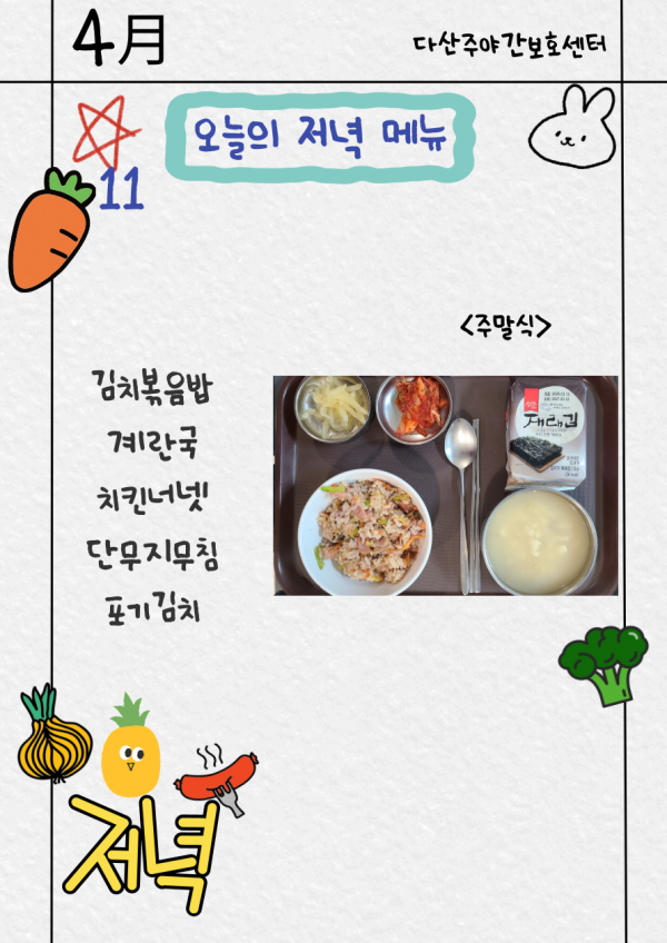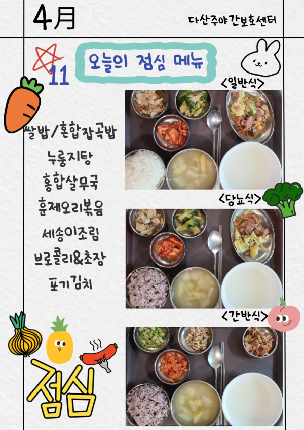 4월11일 (토요일) 오늘의 식단 페이지 정보 작성자 명품다산주야간보호센터 작성일26-04-11 16:05 조회8회 댓글0건 관련링크 다음글 목록 본문 오늘의 식단 입니다. 다음글 목록