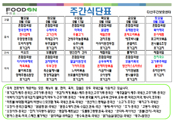 <<< 9월3주차 주간 식단표 >>> 페이지 정보 작성자 명품다산주야간보호센터 작성일25-09-15 08:25 조회1,592회 댓글0건 관련링크 이전글 다음글 목록 본문 9월3주차 주간 식단표 입니다. 이전글 다음글 목록