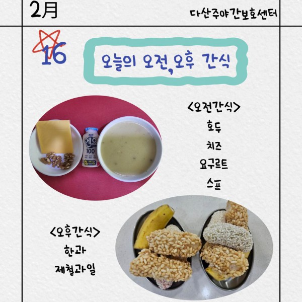 2월16일 오전/오후간식 페이지 정보 작성자 명품다산주야간보호센터 작성일26-02-16 16:45 조회663회 댓글0건 관련링크 이전글 다음글 목록 본문 오전/오후간식 입니다. 이전글 다음글 목록