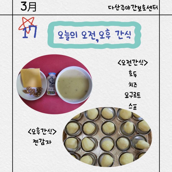 3월17일 오전/오후간식 페이지 정보 작성자 명품다산주야간보호센터 작성일26-03-17 15:01 조회613회 댓글0건 관련링크 이전글 다음글 목록 본문 오전/오후간식 입니다. 이전글 다음글 목록