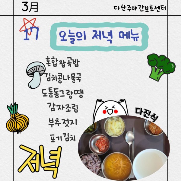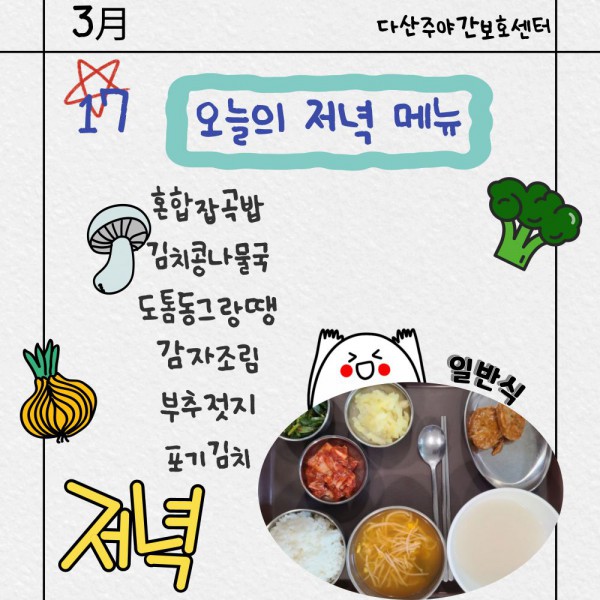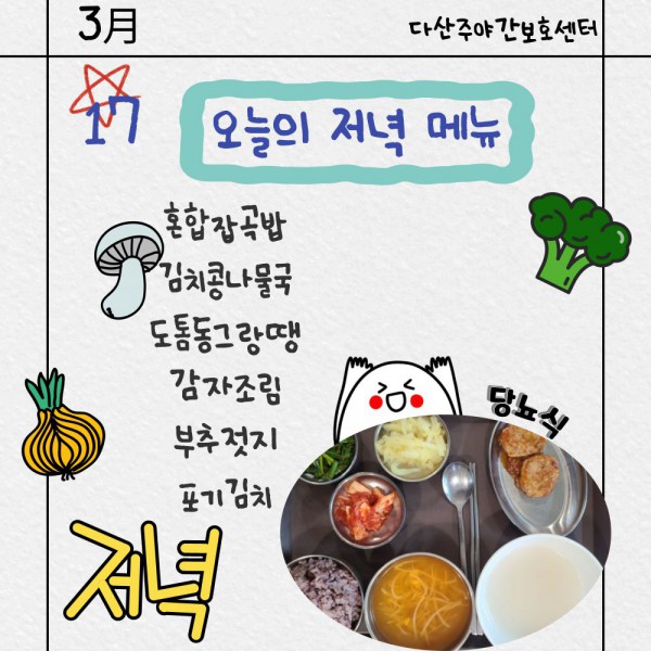 3월17일 저녁식단 페이지 정보 작성자 명품다산주야간보호센터 작성일26-03-17 16:10 조회618회 댓글0건 관련링크 이전글 다음글 목록 본문 저녁식단 입니다.(일반식,당뇨식,간반식) 이전글 다음글 목록