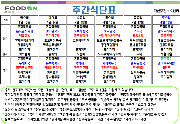 <<< 4월3주차 주간 식단표 >>> 페이지 정보 작성자 명품다산주야간보호센터 작성일26-04-13 08:49 조회60회 댓글0건 관련링크 이전글 다음글 목록 본문 4월3주차 주간 식단표 입니다. 이전글 다음글 목록