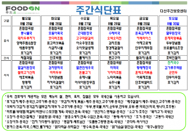 <<< 8월4주차 주간 식단표 >>> 페이지 정보 작성자 명품다산주야간보호센터 작성일25-08-25 07:11 조회1,711회 댓글0건 관련링크 이전글 다음글 목록 본문 8월4주차 주간 식단표 입니다. 이전글 다음글 목록