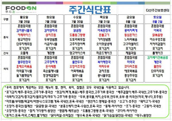 <<< 7월5주차 주간 식단표 >>> 페이지 정보 작성자 명품다산주야간보호센터 작성일25-07-28 07:29 조회1,720회 댓글0건 관련링크 이전글 다음글 목록 본문 7월5주차 주간 식단표 입니다. 이전글 다음글 목록