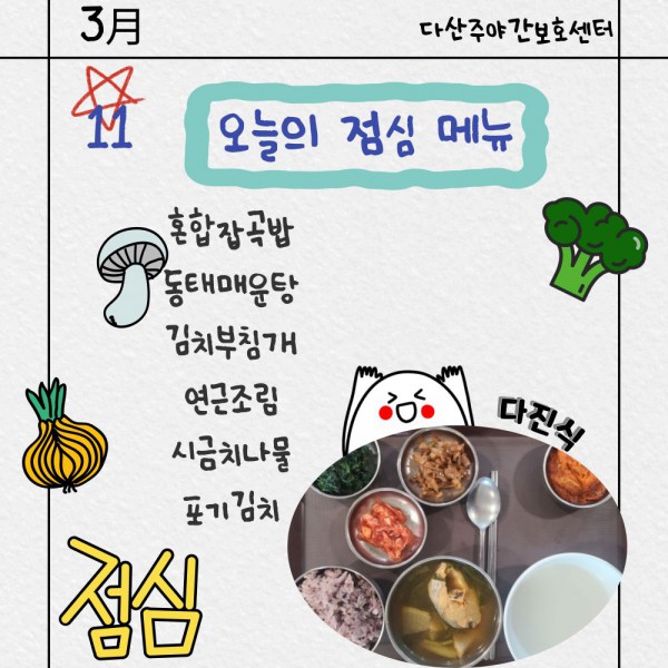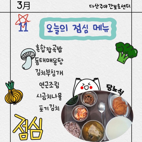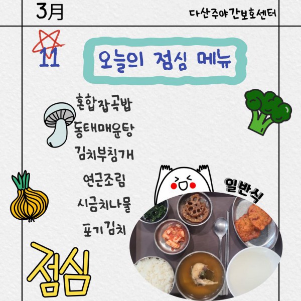 3월11일 점심식단 페이지 정보 작성자 명품다산주야간보호센터 작성일26-03-11 11:53 조회625회 댓글0건 관련링크 이전글 다음글 목록 본문 점심식단 입니다.(일반식,당뇨식,간반식) 이전글 다음글 목록