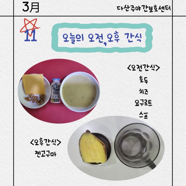 3월11일 오전/오후간식 페이지 정보 작성자 명품다산주야간보호센터 작성일26-03-11 15:34 조회619회 댓글0건 관련링크 이전글 다음글 목록 본문 오전/오후간식 입니다. 이전글 다음글 목록