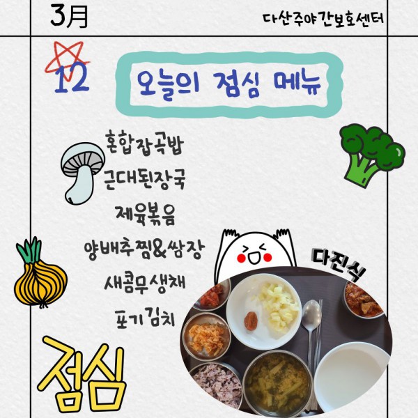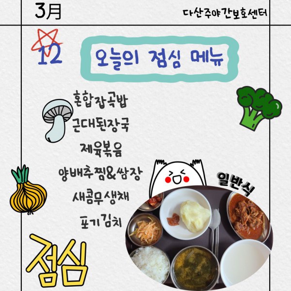 3월12일 점심식단 페이지 정보 작성자 명품다산주야간보호센터 작성일26-03-12 11:10 조회603회 댓글0건 관련링크 이전글 다음글 목록 본문 점심식단 입니다.(일반식,당뇨식,간반식) 이전글 다음글 목록