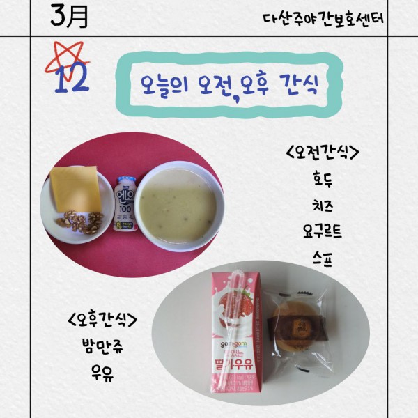3월12일 오전/오후간식 페이지 정보 작성자 명품다산주야간보호센터 작성일26-03-12 15:15 조회601회 댓글0건 관련링크 이전글 다음글 목록 본문 오전/오후간식 입니다. 이전글 다음글 목록