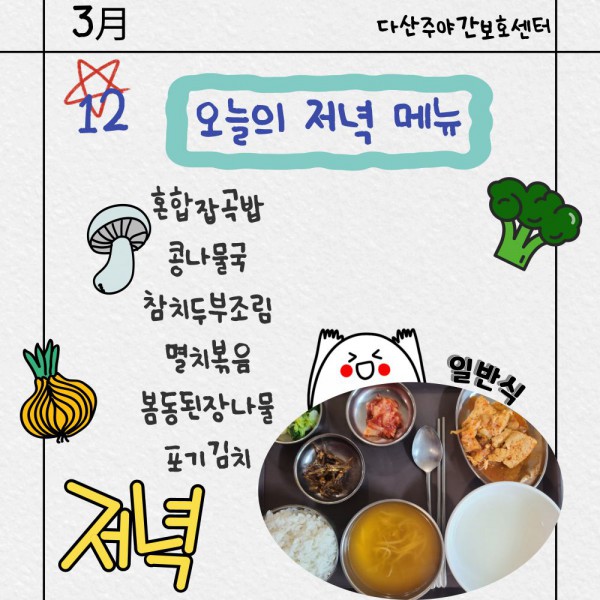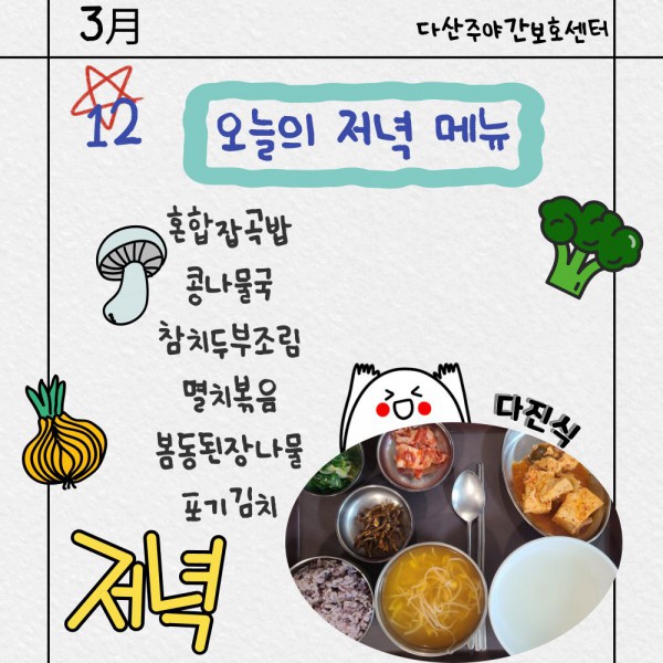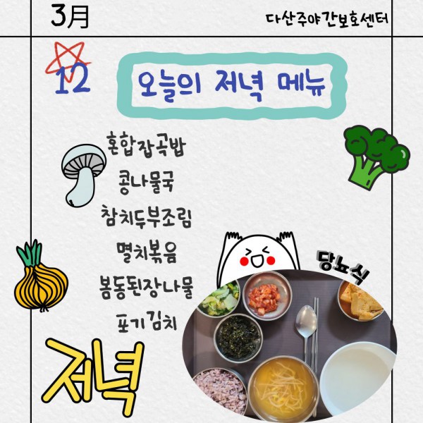 3월12일 저녁식단 페이지 정보 작성자 명품다산주야간보호센터 작성일26-03-12 16:06 조회592회 댓글0건 관련링크 이전글 다음글 목록 본문 저녁식단 입니다.(일반식,당뇨식,간반식) 이전글 다음글 목록